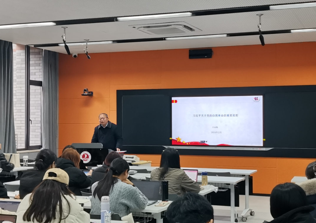 2024年3月4日,在明德楼253教室,吕延勤经理在《习近平新时代中国特色社会主义思想专题研究》的学位核心课上,讲解专题《自我革命:跳出历史周期律的第二个答案》。吕延勤经理是本课程团队的课程导师,马院老师们进行现场观摩。